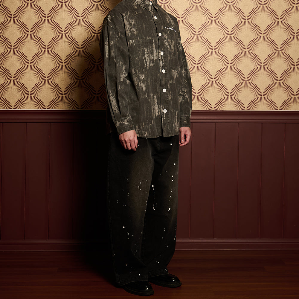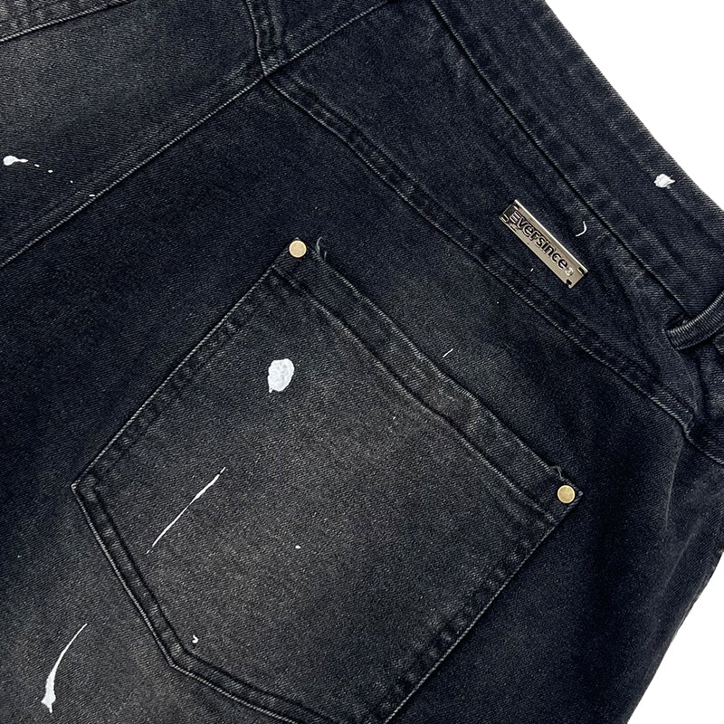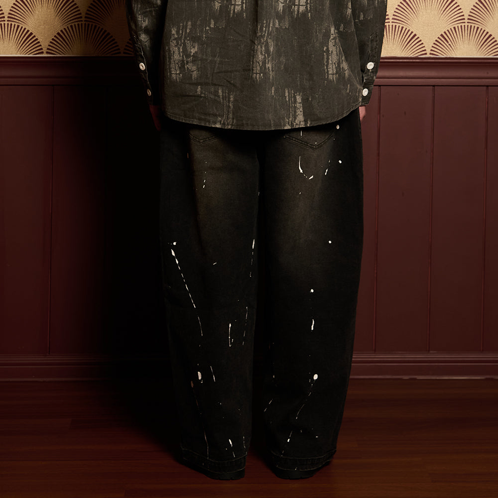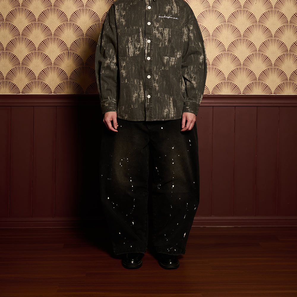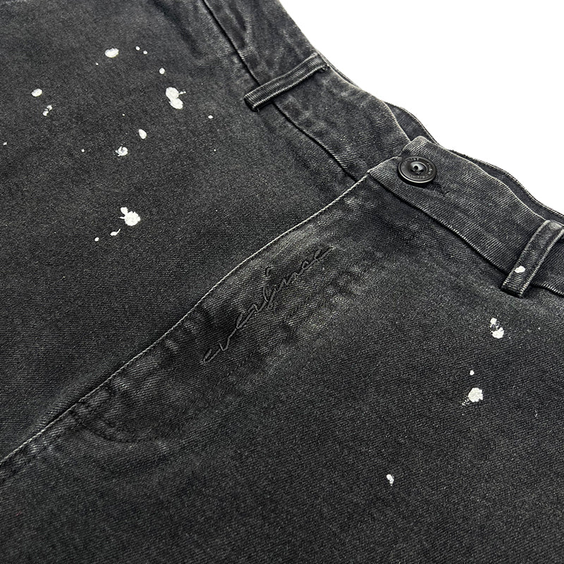 Crafted from premium denim, the pant features a splash paint effect that adds raw character across the body. Two side panels define the form, while two back pockets anchor functionality. A subtle front embroidery completes the piece — controlled detail against expressive volume.