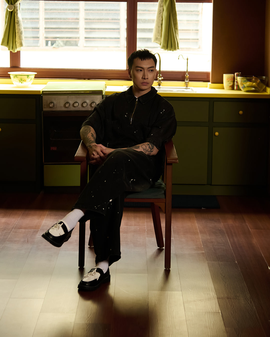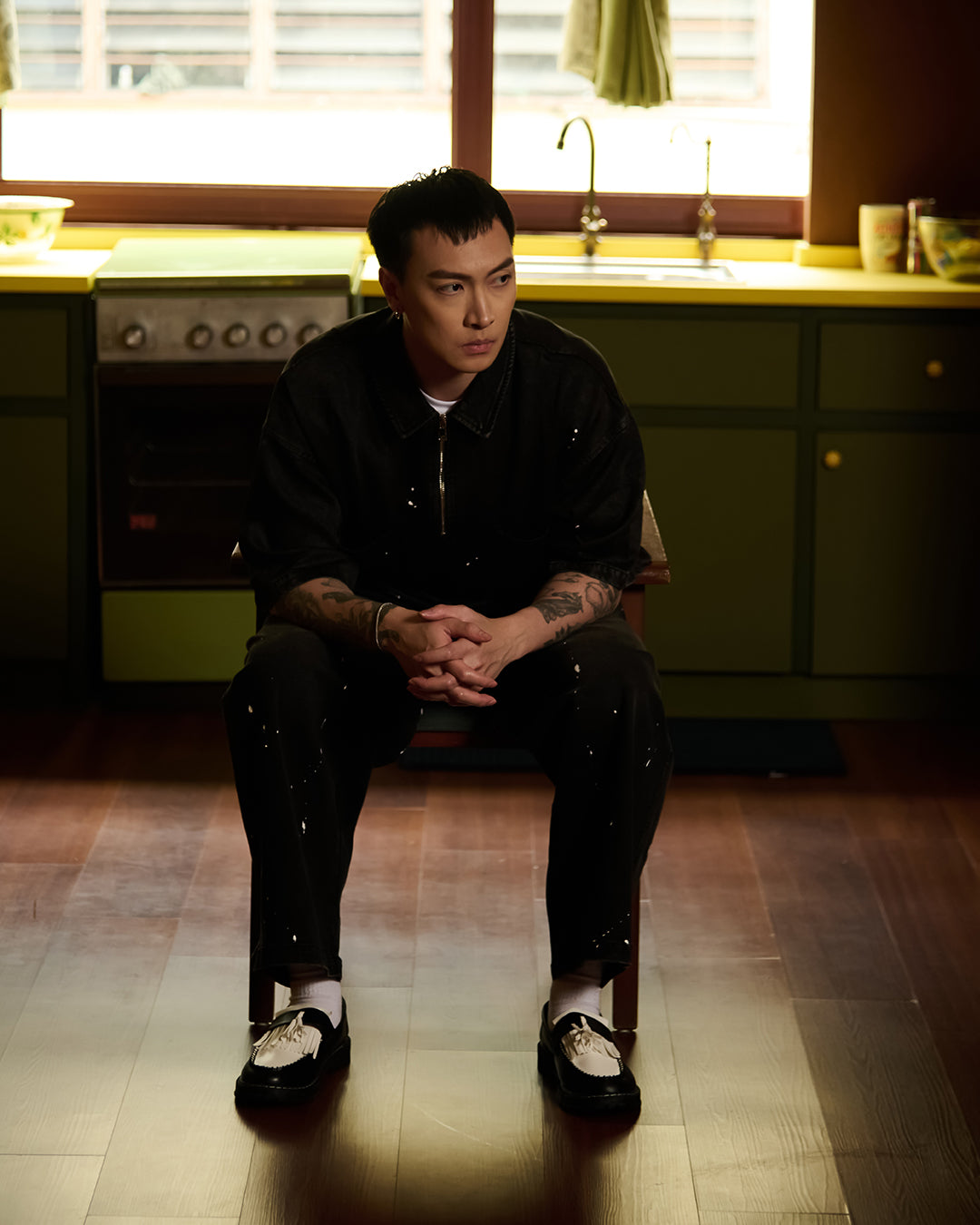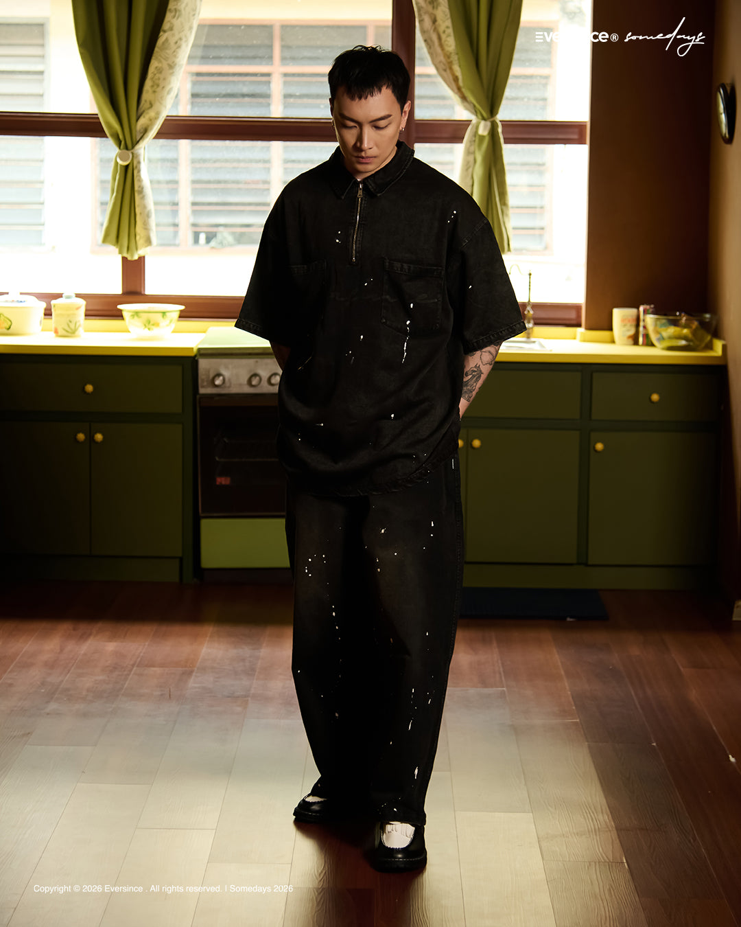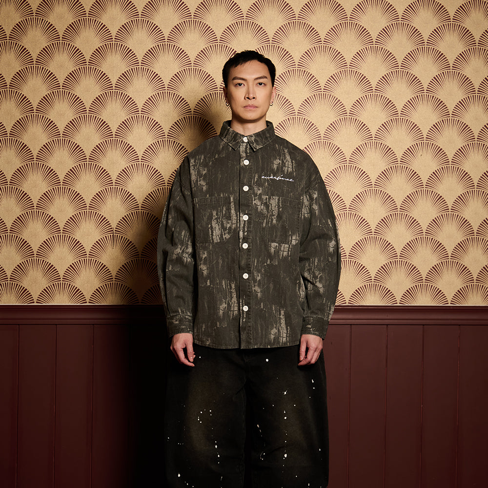 Crafted from premium denim, the pant features a splash paint effect that adds raw character across the body. Two side panels define the form, while two back pockets anchor functionality. A subtle front embroidery completes the piece — controlled detail against expressive volume.