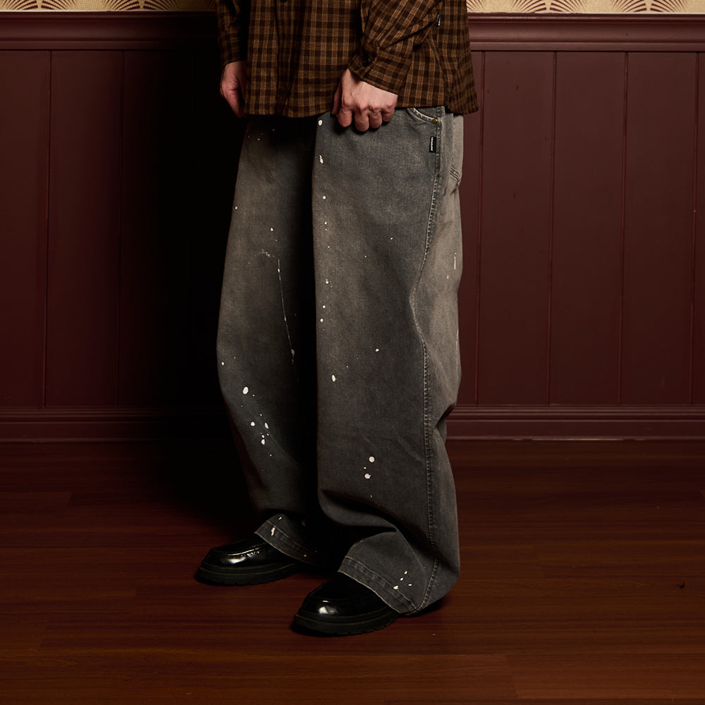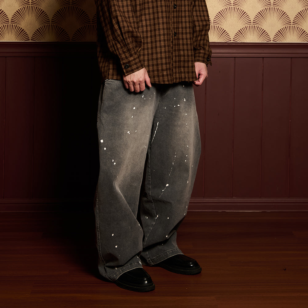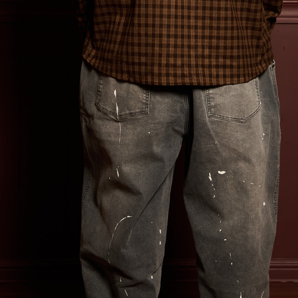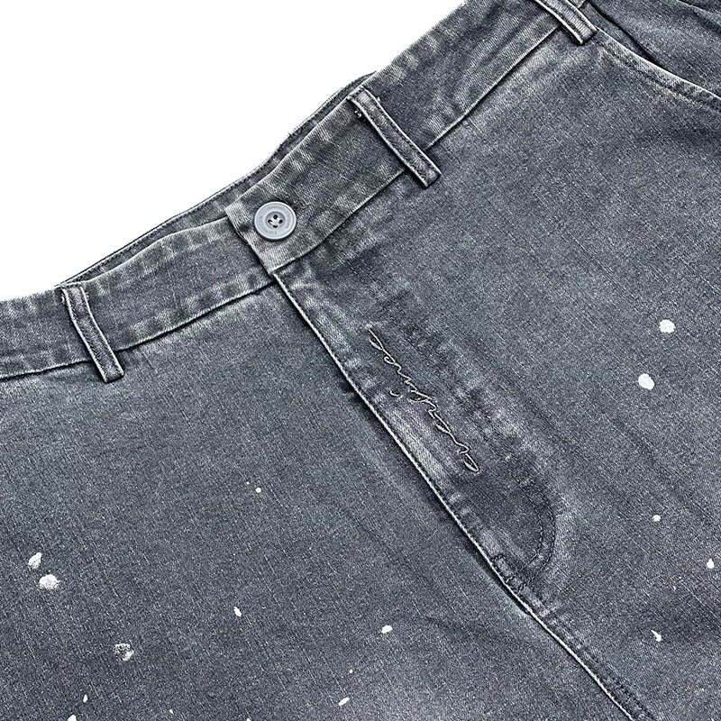 Crafted from premium denim, the pant features a splash paint effect that adds raw character across the body. Two side panels define the form, while two back pockets anchor functionality. A subtle front embroidery completes the piece — controlled detail against expressive volume.