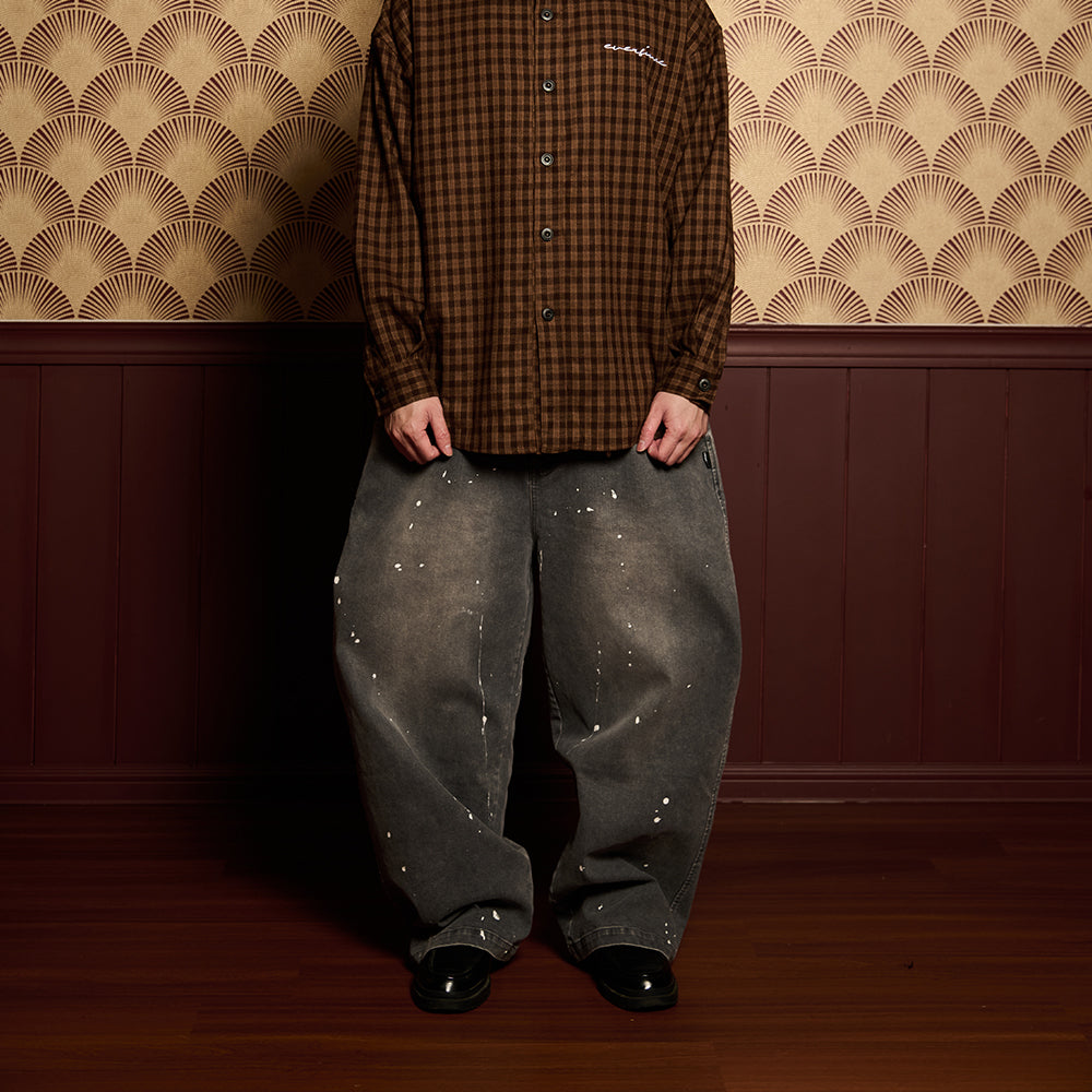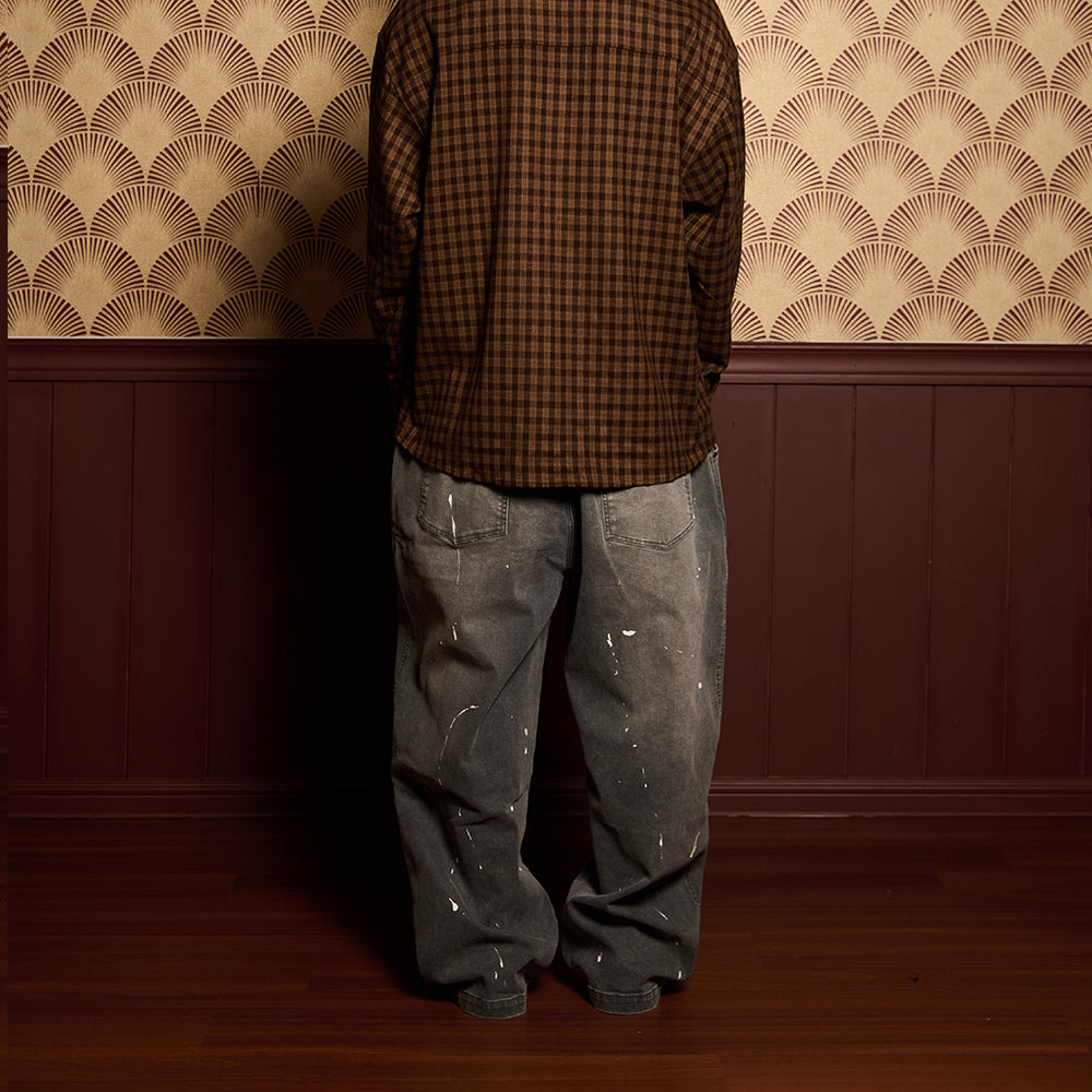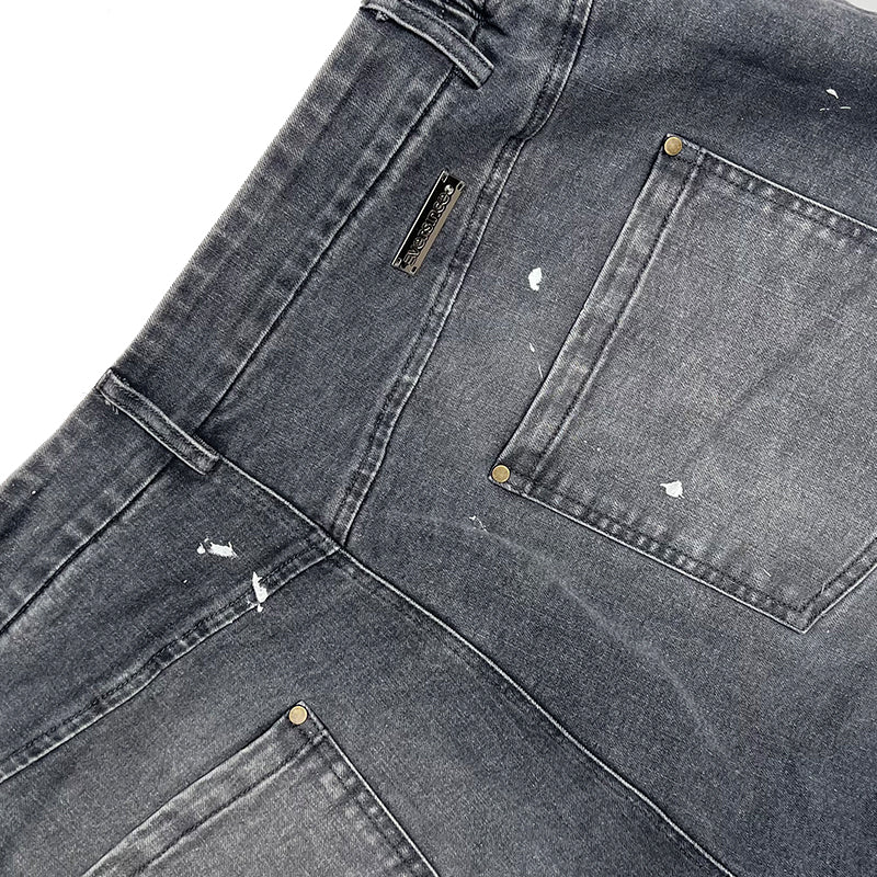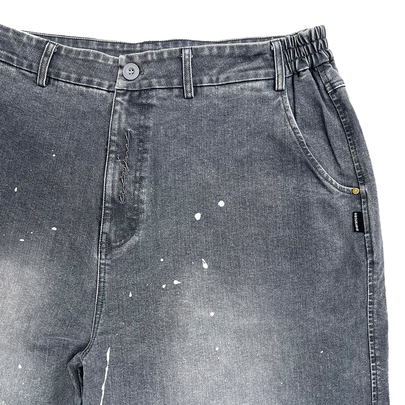 Crafted from premium denim, the pant features a splash paint effect that adds raw character across the body. Two side panels define the form, while two back pockets anchor functionality. A subtle front embroidery completes the piece — controlled detail against expressive volume.