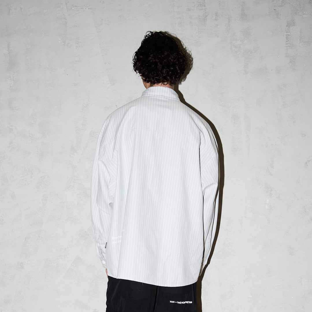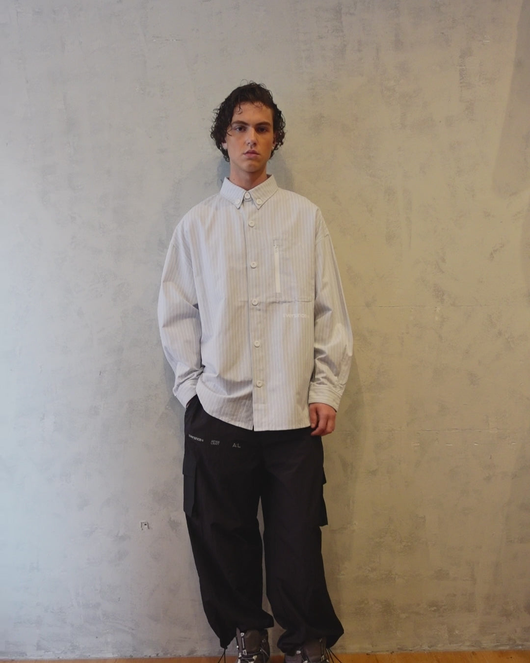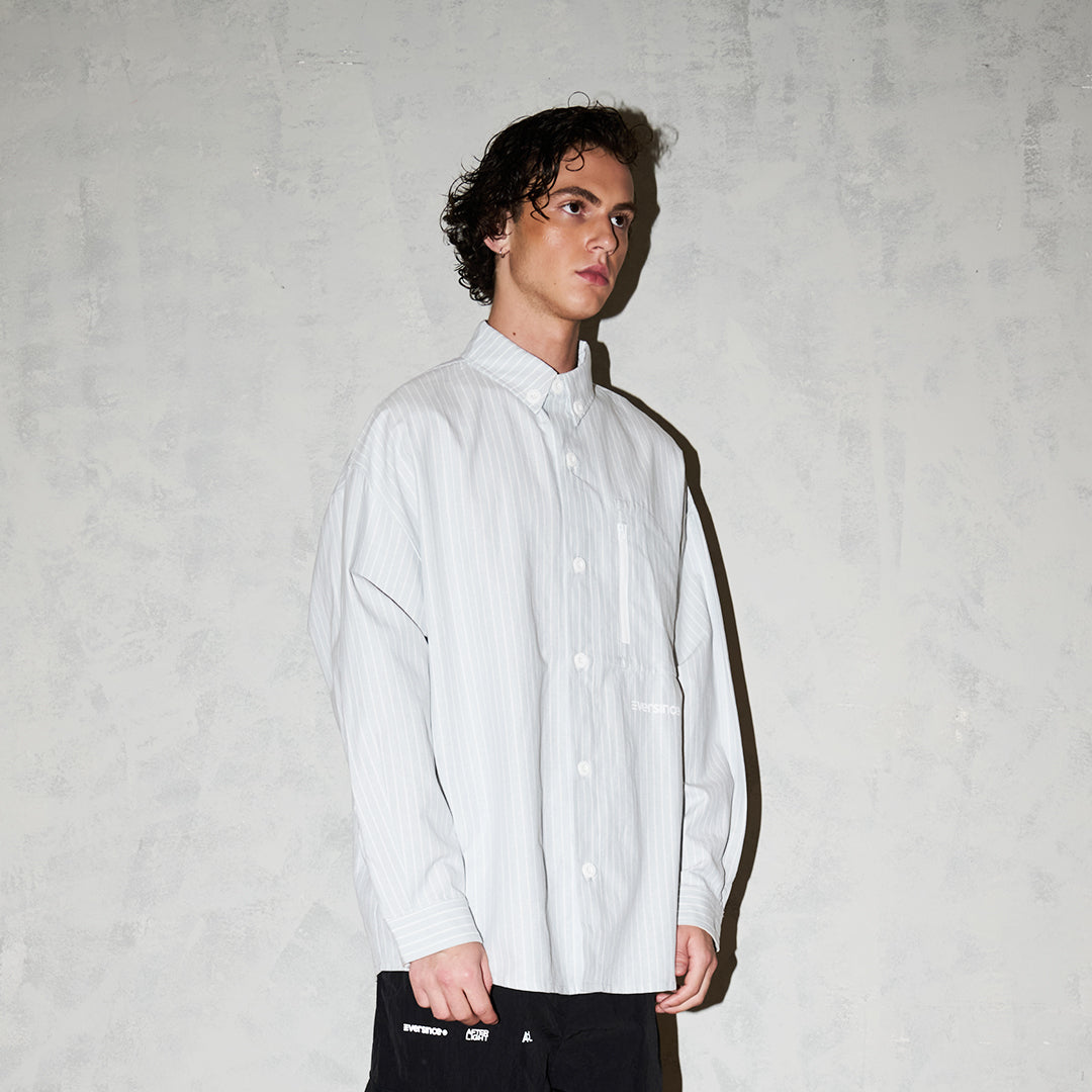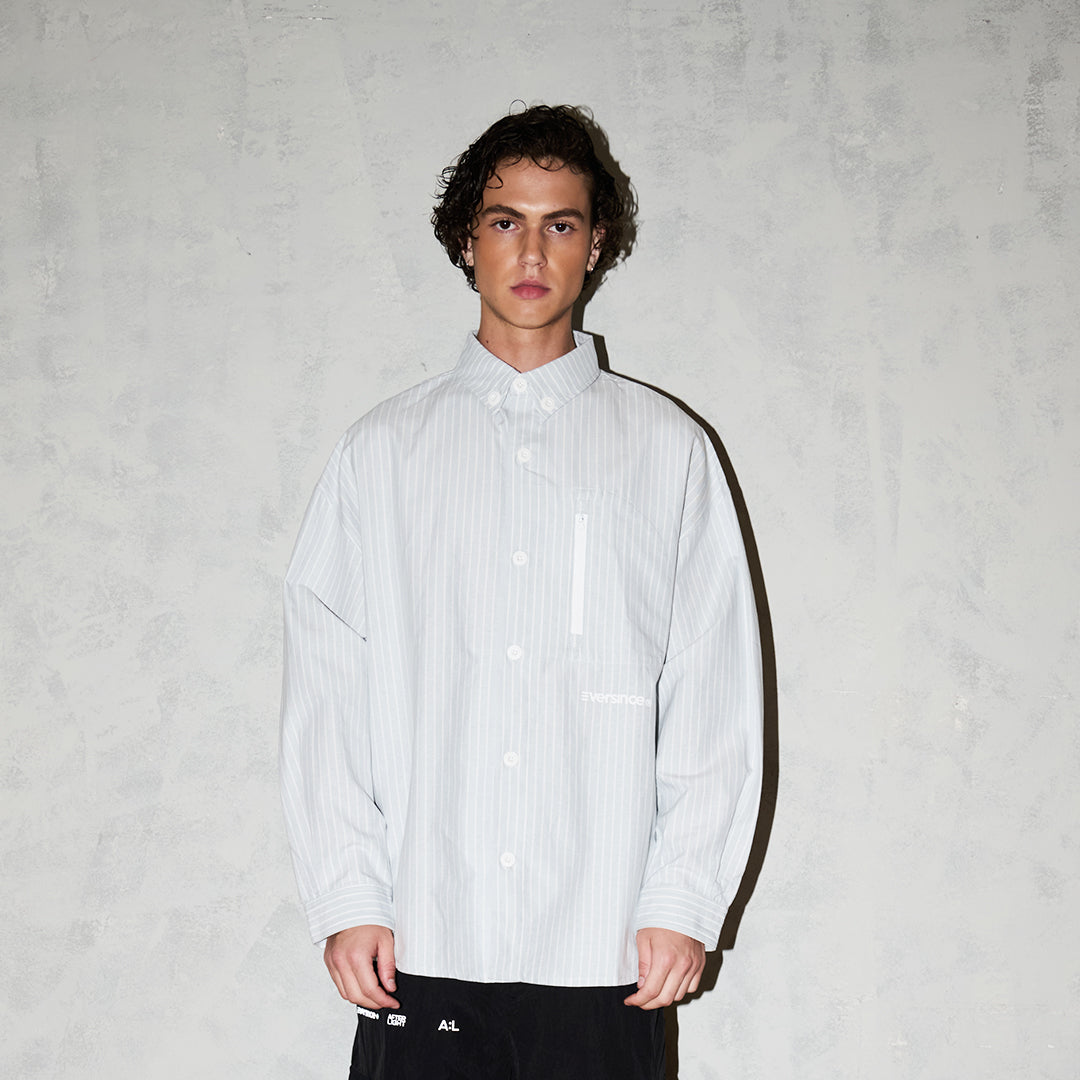 Classic lines, modern function. The SLICK shirt reworks striped fabric into an oversized silhouette, finished with a hidden front pocket sealed by a water-resistant zip. Utility detail disguised in clean design.