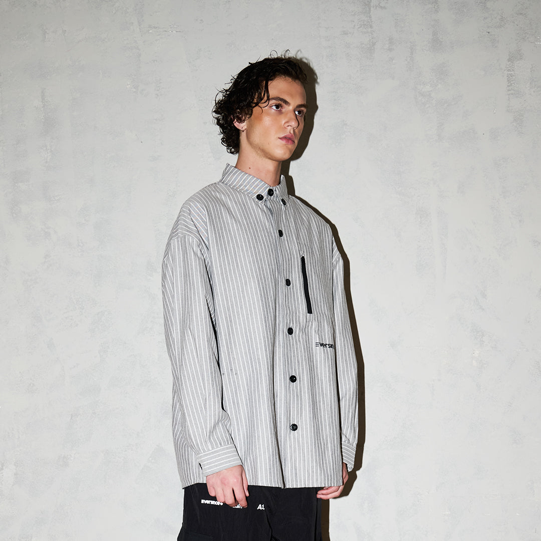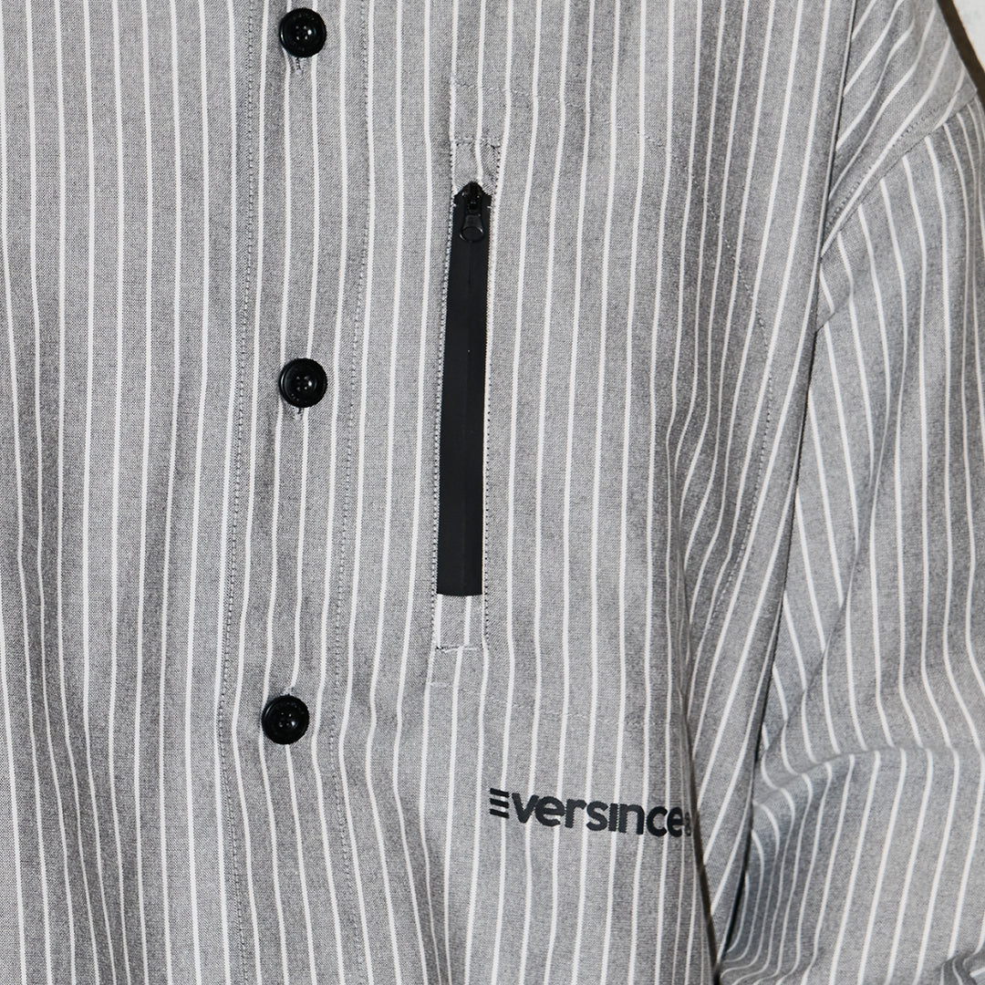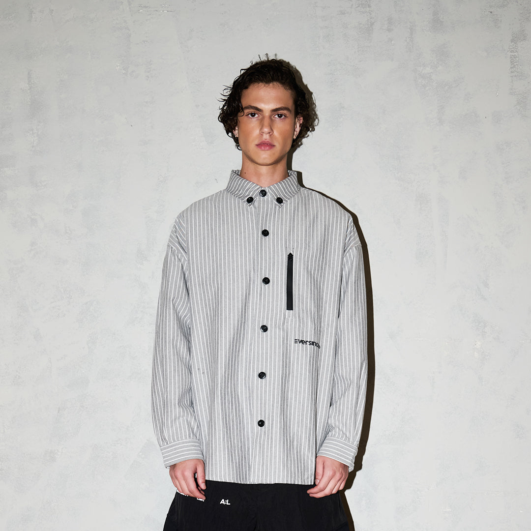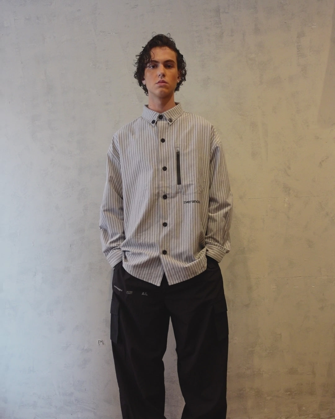 Classic lines, modern function. The SLICK shirt reworks striped fabric into an oversized silhouette, finished with a hidden front pocket sealed by a water-resistant zip. Utility detail disguised in clean design.