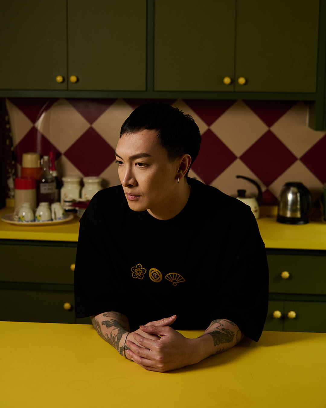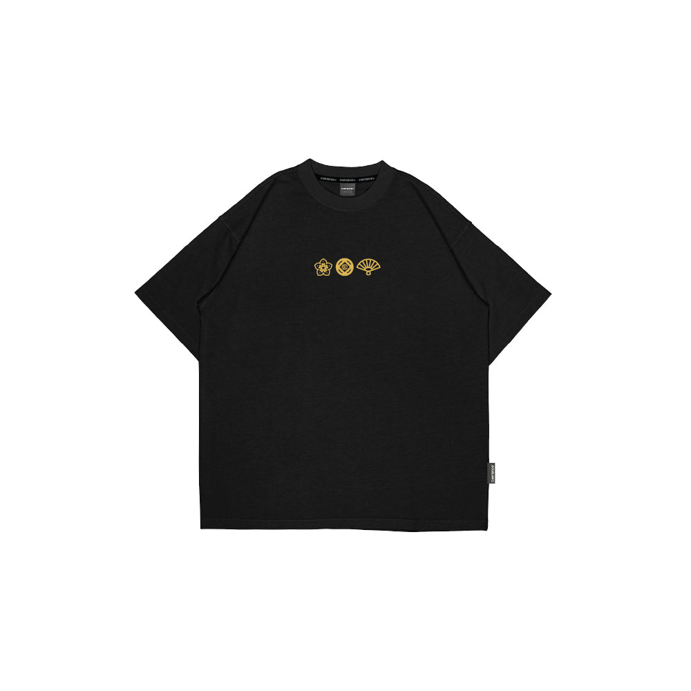 Front gold print: three CNY symbolic icons